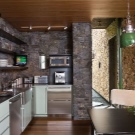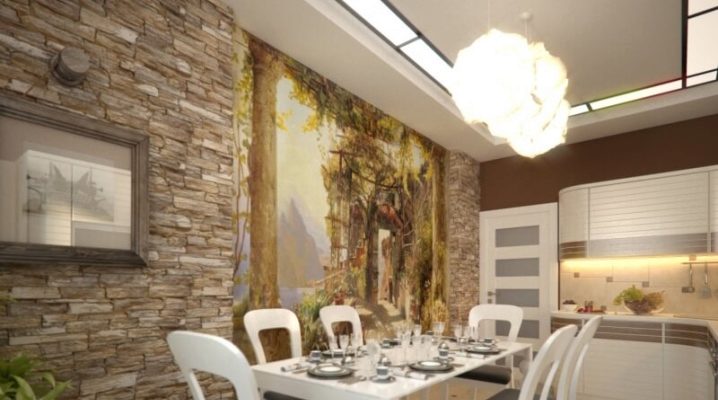 Съвременните кухни често са завършени с естествен или изкуствен камък. Това е много издръжлив материал, чието използване може коренно да промени кухненския интериор. Този дизайн на стена до печката или близо до масата е идеален за селски стил. Каменната зидария под формата на огнище или камина ще направи кухнята необичайно уютна, благоприятна за спокойно семейно забавление.