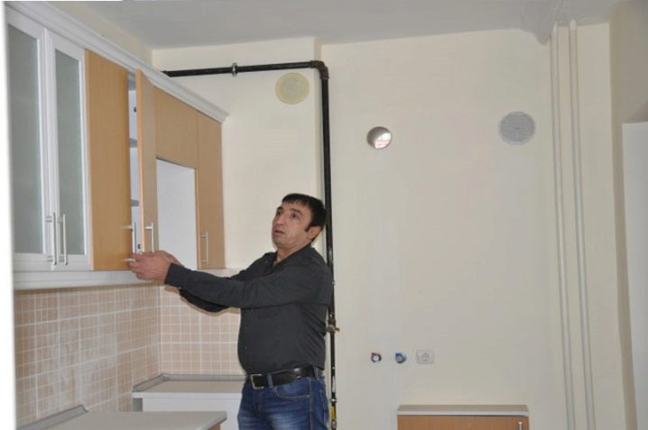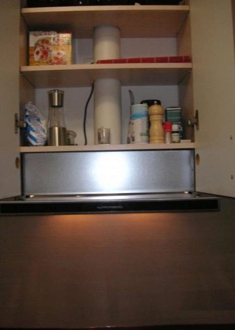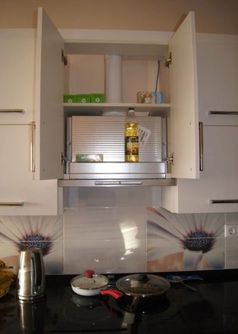 В малка кухня всеки сантиметър е важен и е изключително обидно да се даде значителна част от стената под капака. Съществува обаче специален шкаф, който е в състояние да затвори изпускателния канал..