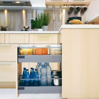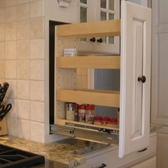 Гардероб за плъзгане, който ви позволява да скриете кухненските прибори, също ще бъде добра покупка. Тази конструкция трябва да бъде инсталирана така, че да не е твърде висока или ниска..