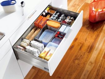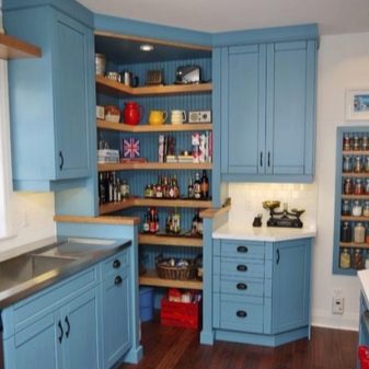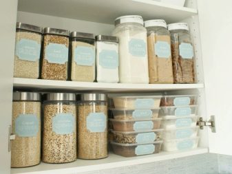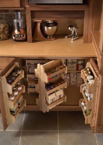 За удобство си струва да поставите няколко кошници, които са необходими за съхранение на подправки, мая, желатин. Кафе, чай, какао и други напитки могат да се събират на едно място, а до тях да се поставят различни сладкиши. Много е удобно да съхранявате мед, растително масло и буркани със сироп в стенен шкаф..