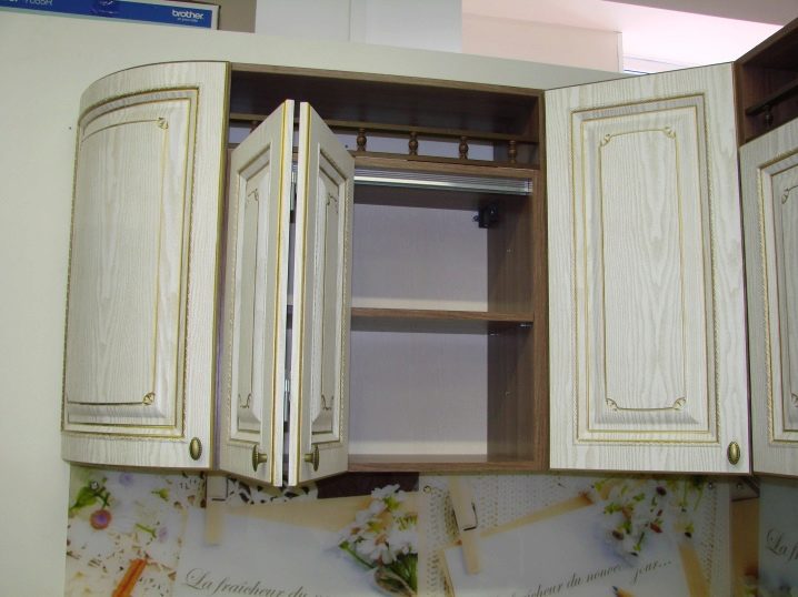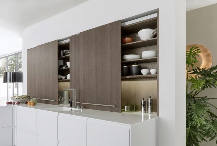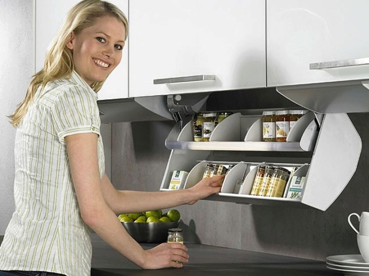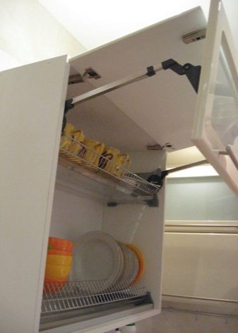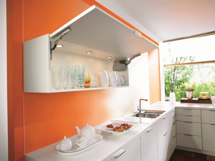Ако всичко е ясно с вътрешното подреждане на шкафовете, тогава си струва да обърнете специално внимание на системата за отваряне на вратите. Шарнирните врати, макар и бюджетни, не са най -добрият избор. Най -добрата алтернатива в този случай е врата, която се отваря нагоре. Благодарение на специални фитинги – газов асансьор – вратата може да бъде фиксирана в повдигнато състояние и тя се връща в първоначалното си състояние гладко и без характерното изскачане.