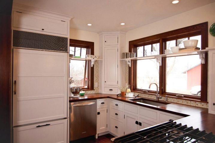 Ъгълът в кухнята не трябва да се дава под шкафа – може да се използва като удобно място за инсталиране на телевизор. Можете също така да поставите шкаф с отворени рафтове в ъгъла, като поставите върху него снимка, фигурки или сувенири, добавяйки домашен уют в кухнята..