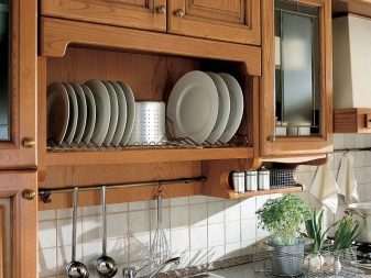 Ако поставите стенен шкаф над мивката, тогава ще бъде много удобно да го използвате за съхранение на чаши, съдове и прибори за хранене. Стъклени и пластмасови контейнери за храна могат да се съхраняват в един и същ шкаф. На един от рафтовете дренажът за съдове ще изглежда добре, което позволява на капчиците вода да се оттичат от чиниите..
