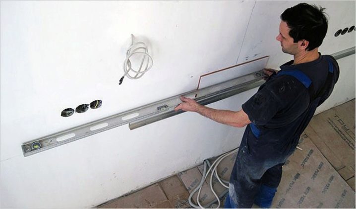 - На мястото, където се планира монтаж на шарнирни кухненски комплекти, е необходимо да се изравнят стените. Това може да стане по два начина: с помощта на сухи смеси (мазилка, шпакловка) и с помощта на листове от гипсокартон. Готовата повърхност трябва да е идеално равна.