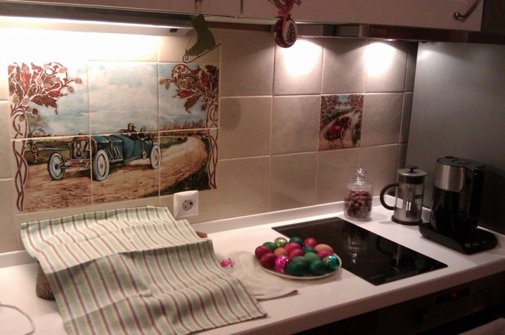 Що се отнася до снимките, това могат да бъдат зеленчуци и плодове, апетитни сладкиши, флорални мотиви, кухненски прибори, ястия и други изображения. За любителите на по -ненатрапчив и спокоен интериор са подходящи абстрактни орнаменти. Ценителите на минимализма могат да изберат обикновена керамика за престилката. В края на краищата дори тази опция ще изглежда красива, при условие, че комбинацията от цветове със слушалките.