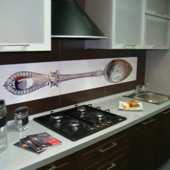 Що се отнася до снимките, това могат да бъдат зеленчуци и плодове, апетитни сладкиши, флорални мотиви, кухненски прибори, ястия и други изображения. За любителите на по -ненатрапчив и спокоен интериор са подходящи абстрактни орнаменти. Ценителите на минимализма могат да изберат обикновена керамика за престилката. В края на краищата дори тази опция ще изглежда красива, при условие, че комбинацията от цветове със слушалките.