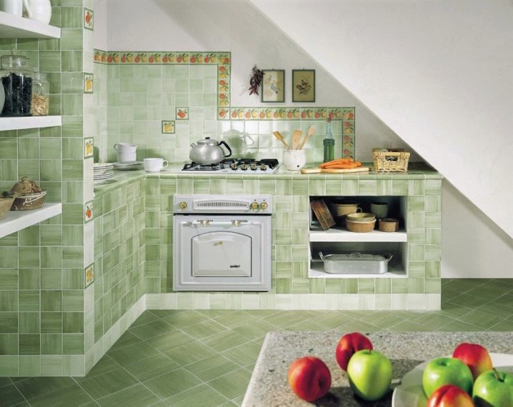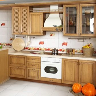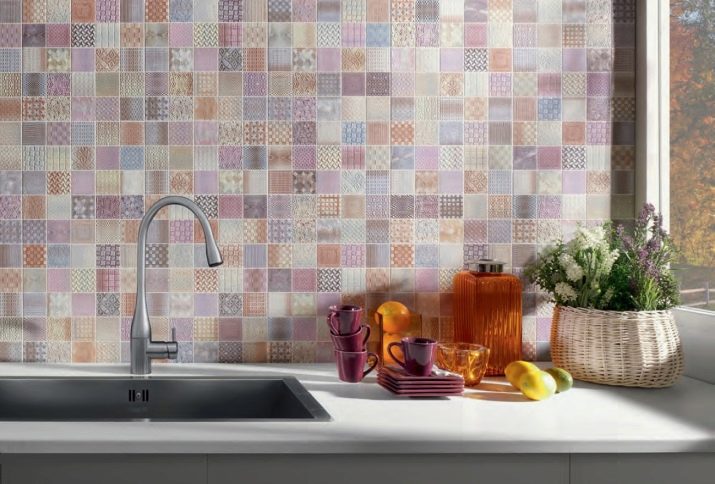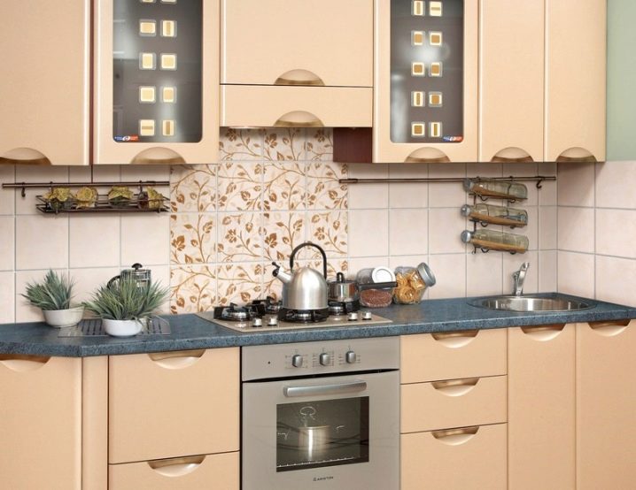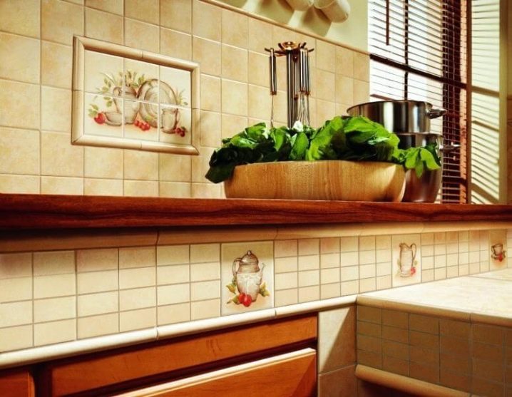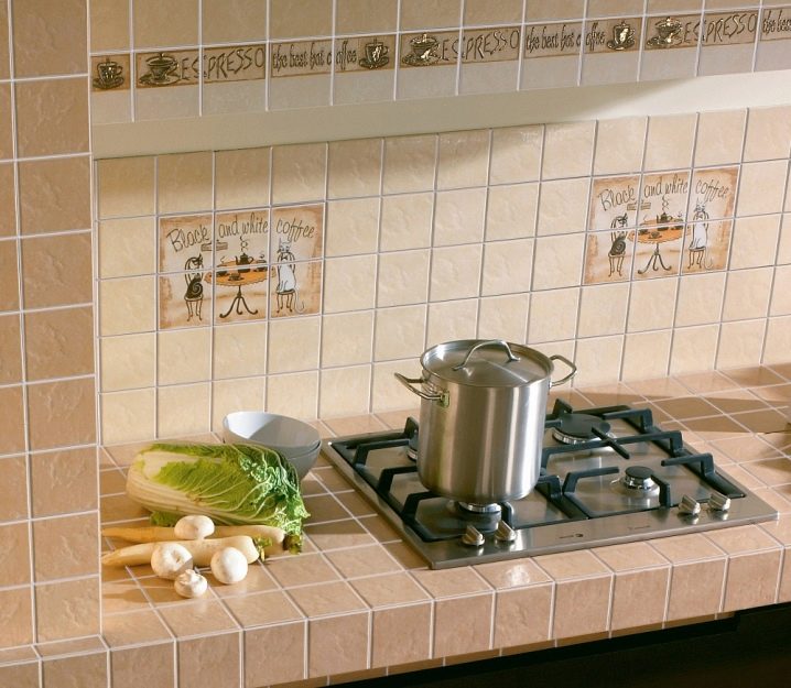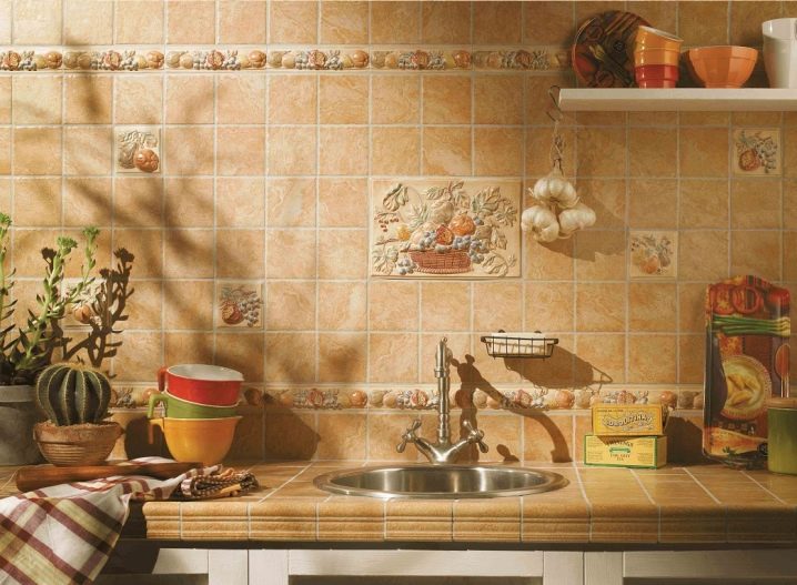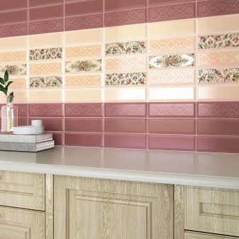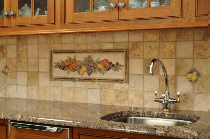 За престилката над плота можете да вземете обикновена рисунка или модел за този цвят. Обикновено се избират меки цветя, плодове или абстрактни форми. Те могат да бъдат гравирани върху отделни плочки или подредени от няколко парчета..