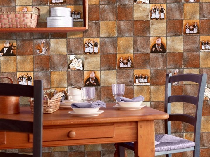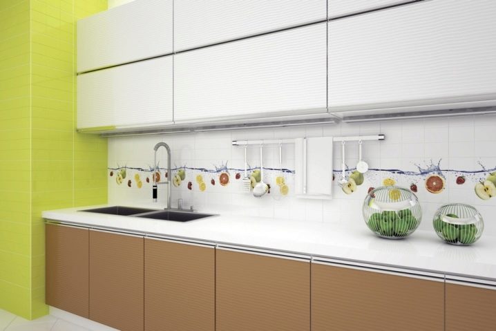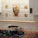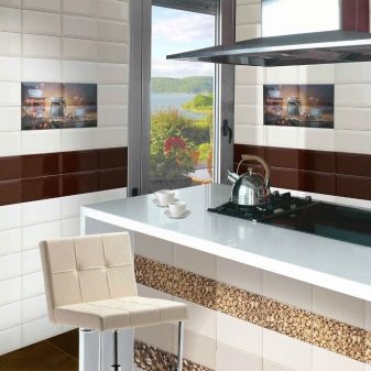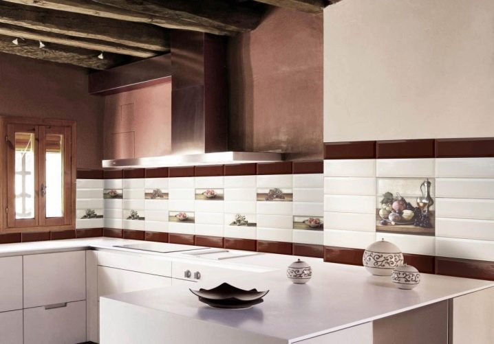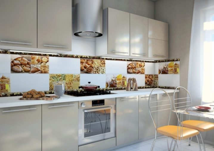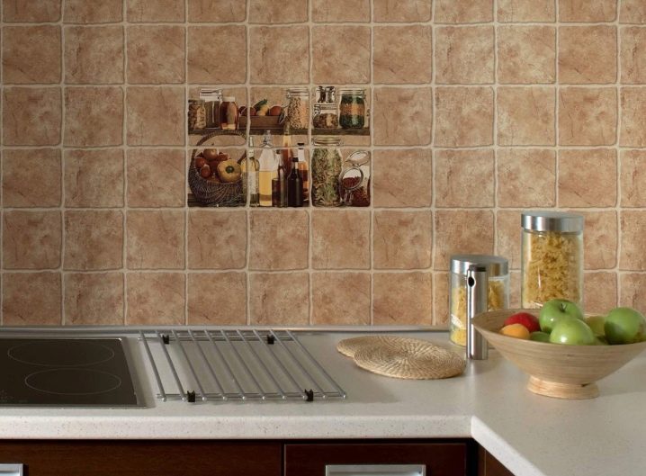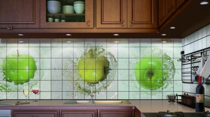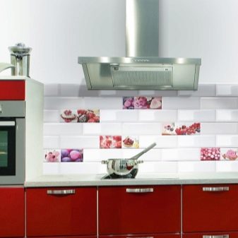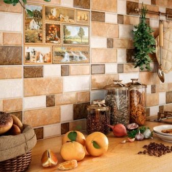 Разположена престилка в кухнята от плочки с фотопечат може да направи впечатление.