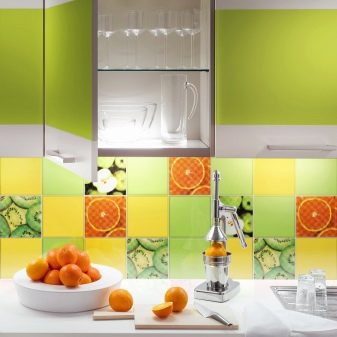 Друг популярен вид съвременна декорация е използването на фотопечатни плочки. Технологиите дават възможност за създаване на ясни шарки с всякакви ярки цветове върху остъклената повърхност на керамика, която ще запази свежестта им за дълго време. По този начин можете да създадете всеки натюрморт или фото панел, който харесвате..