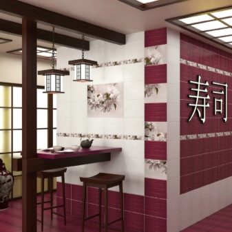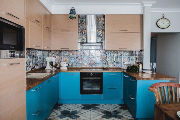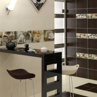 Интересно в дизайна на кухнята е използването на контрастни плочки в няколко тона. Тук е важно да изберете правилните цветове, които да съответстват на интериорните детайли и да не прекалявате с тяхното разнообразие..