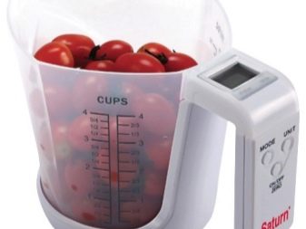 - Измервателна чаша – Може би най -практичният модел на кухненски везни, тъй като има достатъчно голям обем, той ви позволява да претегляте голямо разнообразие от видове продукти с висока точност. Основната характеристика на този тип е, че заедно с теглото можете веднага да измерите обема на продукта, тъй като върху контейнера има специални маркировки. По отношение на удобството, тази везна е много добра, тъй като е лесна за работа и лесна за почистване..