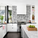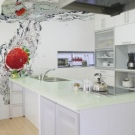- Използването на модерно разнообразие от фототапети набира популярност – 3D тапет. Тоест стенописи с обемна шарка. Те струват значително повече от обикновените фототапети, но се произвеждат специално за кухнята, като се вземат предвид здравината и водоустойчивостта и следователно издържат по -дълго. А обемният чертеж прави кухнята необичайна и добавя пространство..