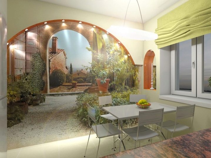 - Тапет може да играе ролята на основния фокусиращ детайл в интериора на кухнята. В допълнение, добре подбраният модел на такива тапети ще ви позволи да изместите границите дори на малка кухня и да създадете външен вид на допълнително пространство. Такива рисунки могат да бъдат панорамни снимки или фотографии с дълбока перспектива (пътеки, улици, различни пейзажи).