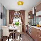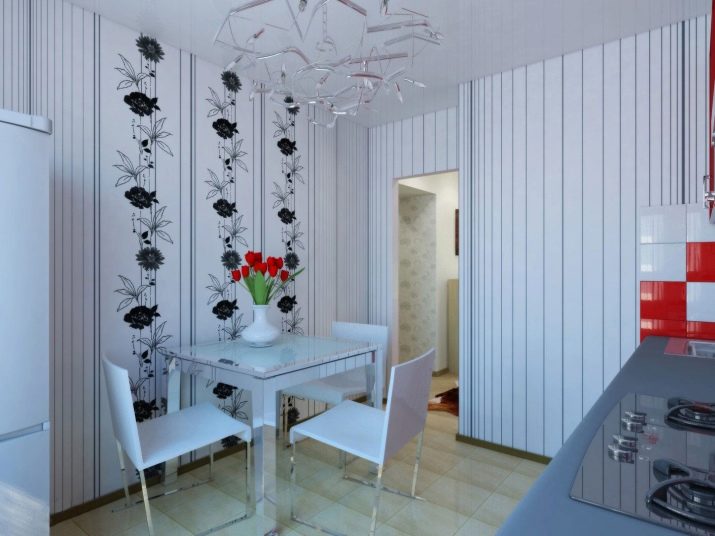 За тясна и дълга кухня е по -подходящ асиметричен метод, когато една стена има комбинация от широки ивици, а останалите имат тапети с ивици с ширина на раната. Този дизайн визуално създава образа на по -квадратна стая. Друг вариант за „разширяване“ на кухнята би бил използването на тапети в светли нюанси на дълги стени и тъмни на къси..