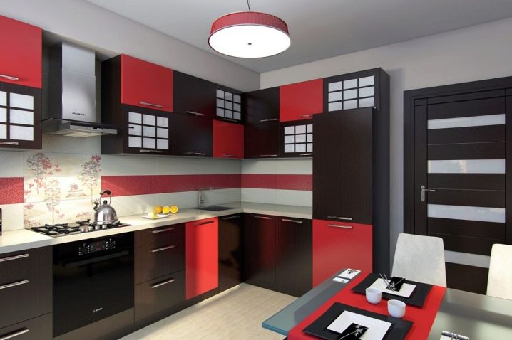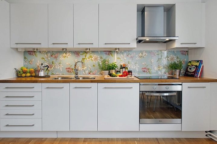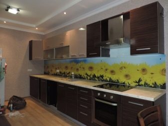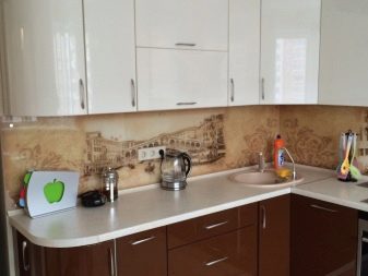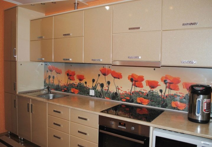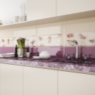 В зависимост от стила, в който е декорирано кухненското пространство, панелите могат да бъдат стъклени, декорирани с керамични плочки, както малки, така и големи, изработени от MDF или пластмаса, които могат да бъдат декорирани както желаете с помощта на фотопечат. Цветовата схема на престилката трябва да се комбинира не само с кухненския комплект, но и с цвета на кухненските стени, а ако сте особено придирчиви, тогава можете да го комбинирате с прибори за хранене и домакински уреди. Контрастните опции са много интересни, например бяла стена и черна лъскава престилка. Също така цялото кухненско пространство може да бъде монотонно, а престилката може да бъде единственият ярък елемент..