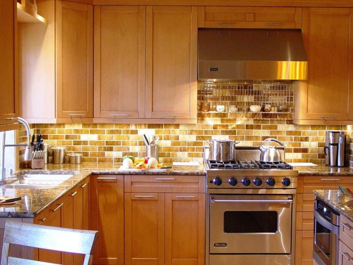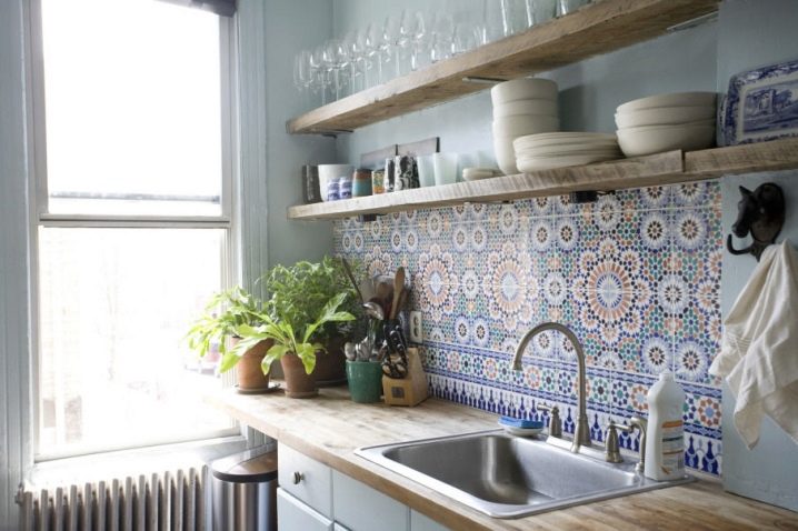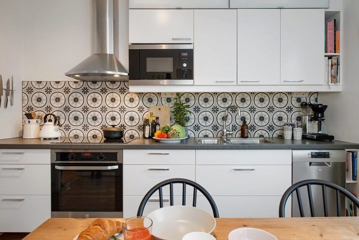 - Ако все пак сте избрали ярка престилка, тя трябва да бъде придружена от допълнителни декоративни елементи от същия цвят. Например, изберете текстил от същия нюанс: завеси, салфетки, кухненски кърпи. Между другото, собствениците на необикновена престилка определено трябва да следят нейната чистота, тъй като всяка мръсотия по такива повърхности е по -забележима от обикновено..