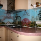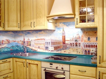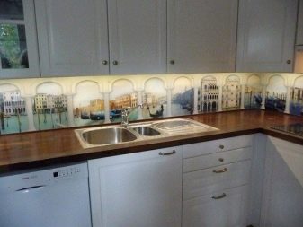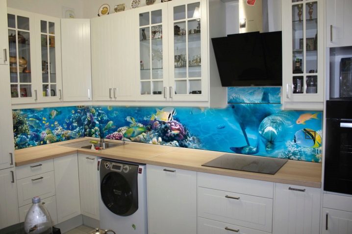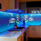 Можете да нанесете всяко изображение върху кухненската престилка с помощта на печат на снимки, стига да пасва на вашия интериор. Морската тема все още е най -популярната. Следователно можете да пресъздадете реалистичен аквариум в интериора с помощта на печат на снимки или дори да поставите нарисувани делфини върху панела.