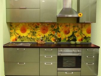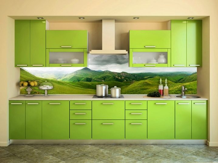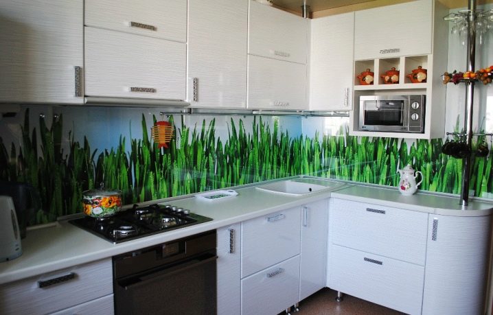 Образът на зелена трева добавя елементи в еко-стил към интериора на кухнята. Зеленината изглежда добре в светла кухня: в бяло, бежово или дори направена под естествено дърво. Белият гланц е особено актуален сега.