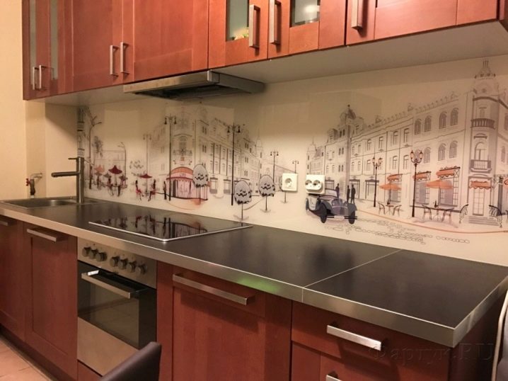 Кухненският панел с изобразен град, особено нощният, ще се впише много добре в пространството на всяка кухня и ще изглежда много достоен и величествен. Престилката може да бъде със светъл нощен град, панорама на небостъргачи или тиха европейска улица. Всичко това ще бъде хипнотизиращо.