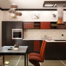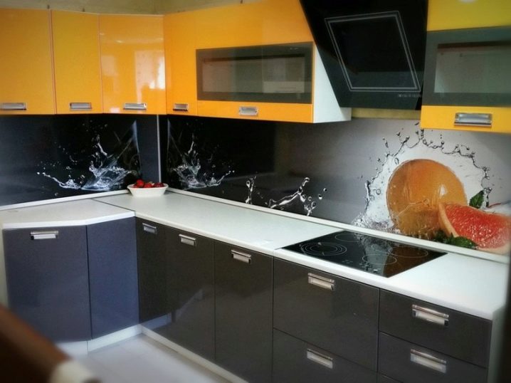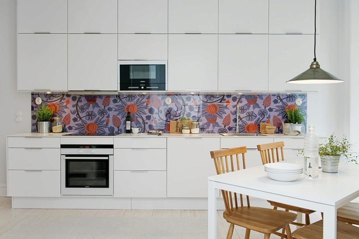 - Когато избирате дизайн за кухненска престилка, първо трябва да решите каква роля ще играе във вашата кухня. Ако той ще служи като фон за ярко кухненско оборудване, тогава панелът трябва да бъде неутрален. И ако искате престилката да бъде основният акцент, тогава трябва да изберете монотонна слушалка и да я допълнете с контрастен наситен цветен панел, снабден с фотопечат.