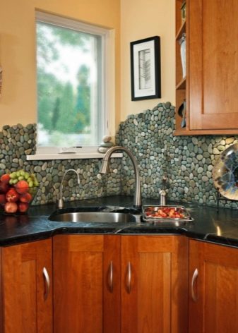 Изкуственият камък е полезен за всички, но може би единственият му недостатък е високата му цена. И този декор ще струва значително повече от керамика и стъкло. Освен това такава престилка обикновено се поръчва заедно с плота, така че да изглеждат като едно цяло. Именно тази комбинация изглежда най -ефективна..