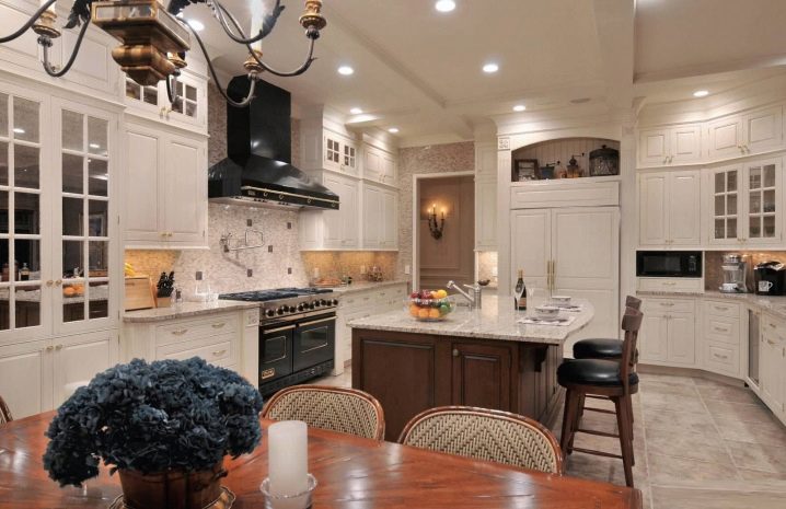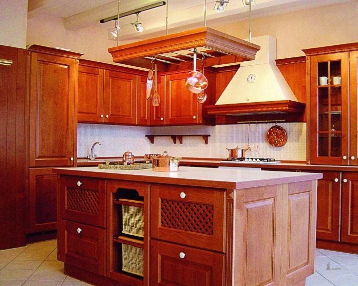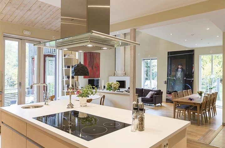 Ако кухненската зона позволява, а работната повърхност на печката се намира в центъра на стаята, тогава е по -добре да предпочетете островна качулка над печката..