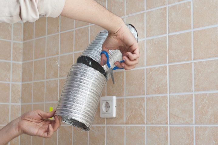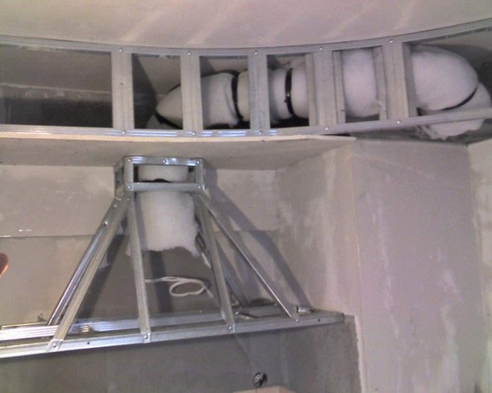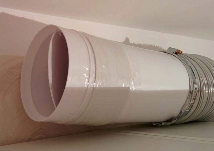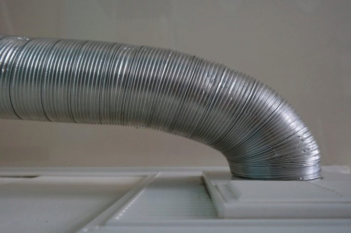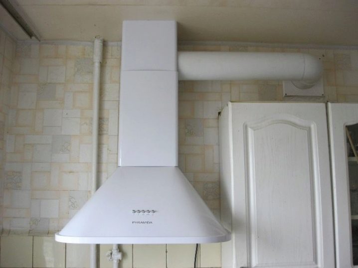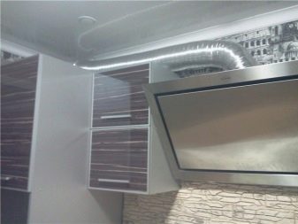 Когато вентилационният отвор не попадне в купола, е необходимо да го издърпате към абсорбатора с помощта на гофриран маркуч. Свържете гофрирания маркуч към аспиратора с разклонител и го заварете (ако аспираторът е от калай) или фиксирайте с уплътнител (когато използвате гипсокартон като материал на аспиратора).