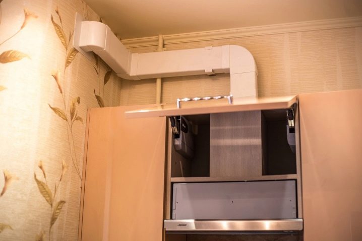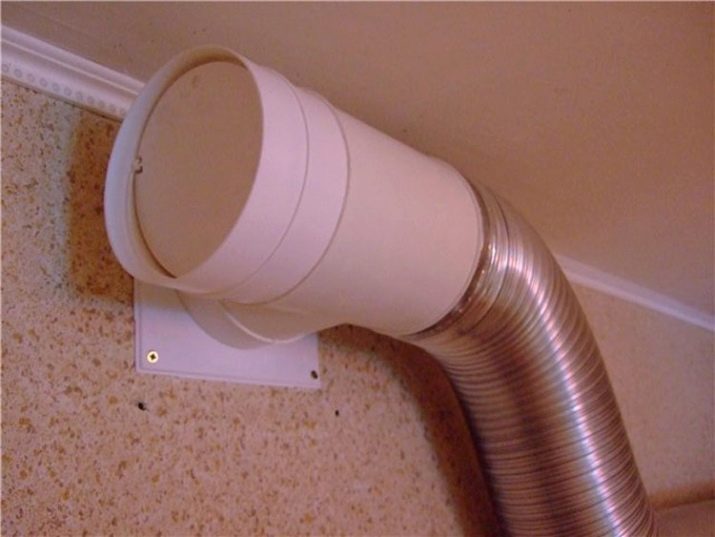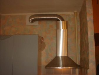 Когато вентилационният отвор не попадне в купола, е необходимо да го издърпате към абсорбатора с помощта на гофриран маркуч. Свържете гофрирания маркуч към аспиратора с разклонител и го заварете (ако аспираторът е от калай) или фиксирайте с уплътнител (когато използвате гипсокартон като материал на аспиратора).
