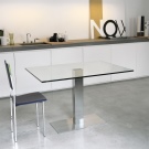 Масите с централна опора са често срещани в кухнята. Преди това тази форма беше инсталирана под масата на списанието, но сега тя плавно се премести в кухнята. Подкрепата на единия крак е чудесен вариант за строги форми и линии, подчертаващи границите на кухнята. Формата може да бъде всякаква: квадратна, кръгла, овална, но винаги е необходимо да се следи разпределението на теглото по периметъра на масата. Свойството за стабилност зависи от дебелината и здравината на опорния стълб.