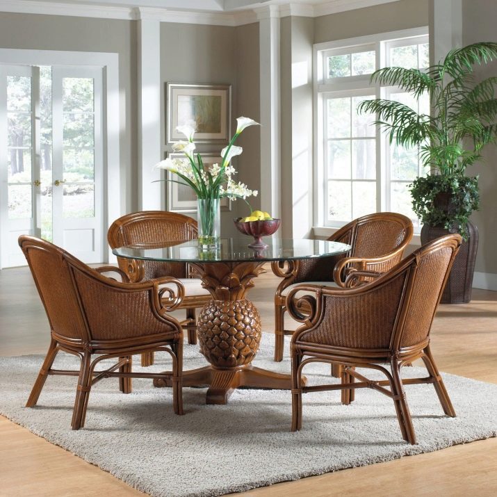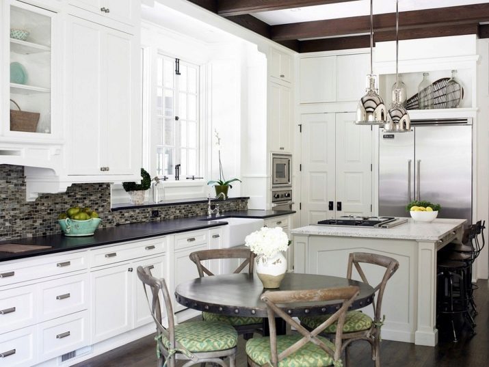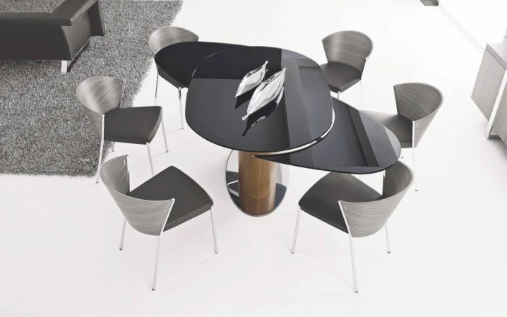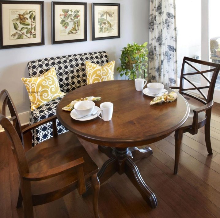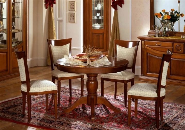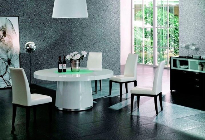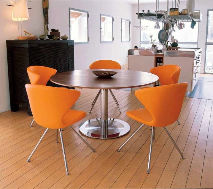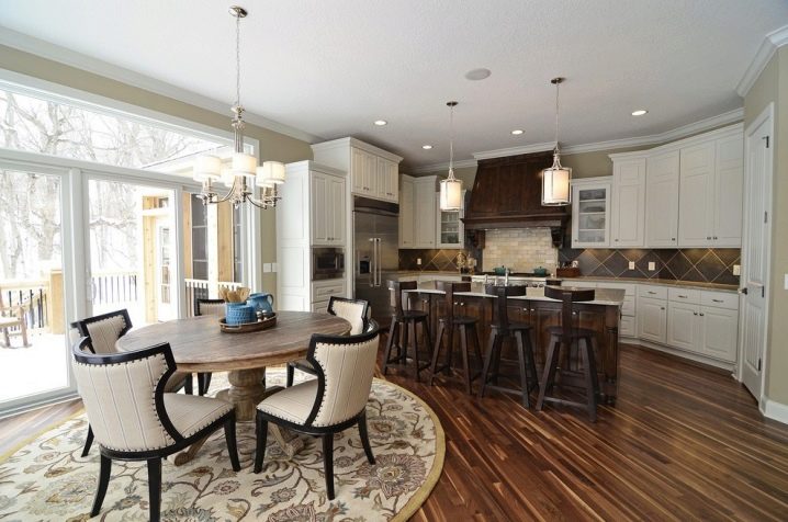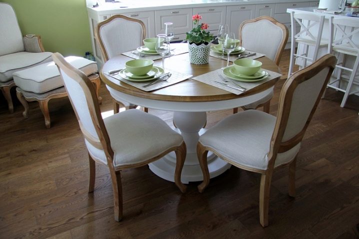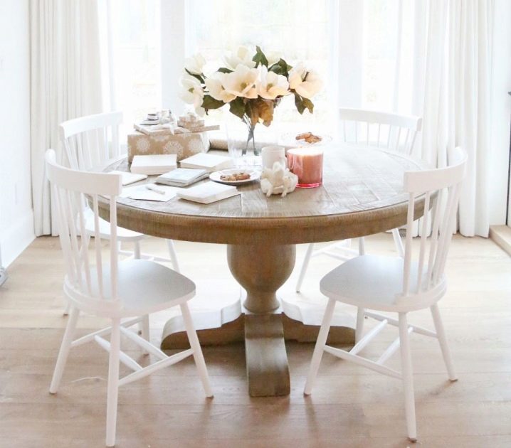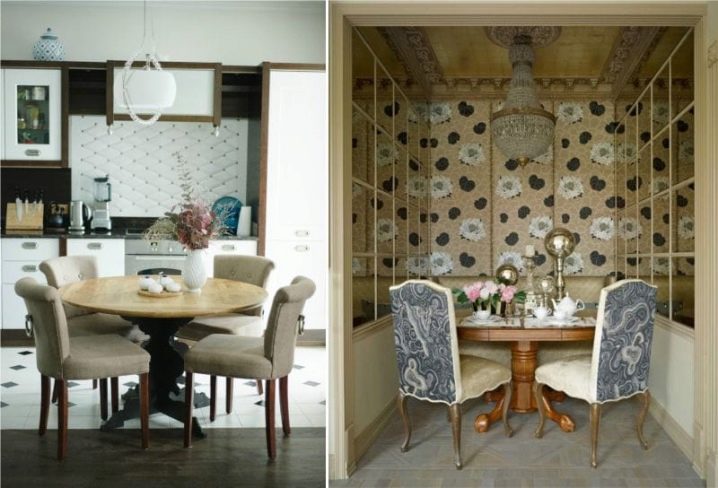 Ако искате да закупите кръгла маса, тогава първо трябва да разберете как размерът й ще се свърже с площта на кухнята. Обикновено тази форма се инсталира в средата на стаята. Освен това има модели, които се разгръщат в няколко области, сякаш се простират. Ако тази форма има и един крак, тогава се създава максимален комфорт за всички седнали. Прави впечатление, че такива опции са украсени с конструктивни детайли и декор – това добавя уникалност към дизайна на кухнята..