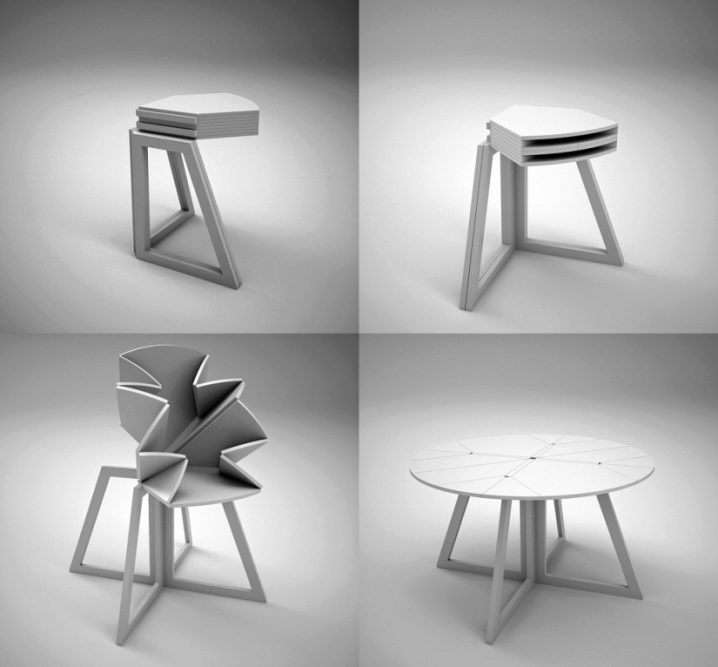 Като начало трябва да помислите изцяло върху дизайна – за тези модели модерните и еклектичните са най -подходящи. Комбинирането на няколко стила в едно пространство е възможно благодарение на допълнителни слушалки и правоъгълна маса. Конструкциите обикновено са прибиращи се или прибиращи се и имат няколко допълнителни отделения.