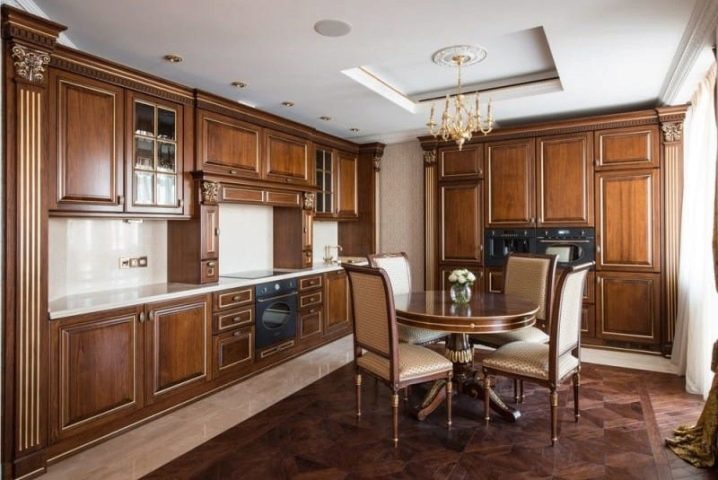 Ако изберете маса от дърво, тогава основното е нейната опорна част и цвят. Комбинацията от тъмни нюанси в кухнята изглежда интересна, но трябва да бъде оформена правилно. И ако масата на крака е със светъл нюанс, тогава е по -добре кухнята да е от съседни нюанси или контрастни;