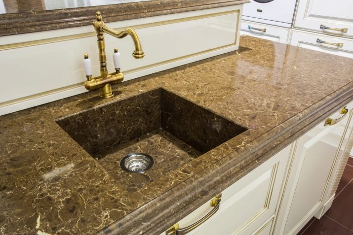 В случай, че обстоятелствата не говорят в полза на екологично чист камък, на помощ може да дойде компромисна опция под формата на мраморни стърготини. Този материал е най -малките парчета естествен мрамор, които са залепени едно за друго с помощта на втвърдена акрилна смола. Поради високото съдържание на синтетични вещества и различна структура, такъв материал излиза по -устойчив на миризми, различни вещества и механични повреди. Освен това дрехата с ярки цветове няма да загуби оттенъка си с течение на времето и под въздействието на фактори като слънчева светлина и перилни препарати..