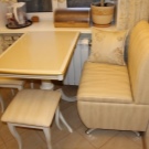 Естествената кожа се счита за по -скъп и практичен вид довършителни материали. Той е издръжлив и устойчив на износване, въпреки че не е удобно да седите на кожени дивани в жегата, а при ниски температури материалът има свойството "тен". Следователно за кухнята като алтернатива могат да се използват модели, които използват универсални материали..