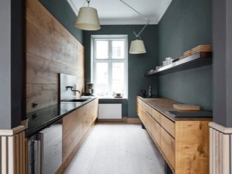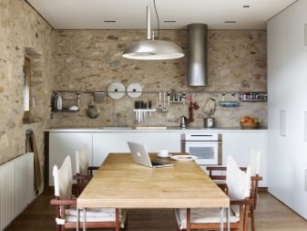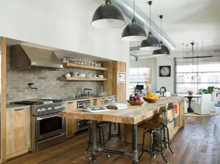 Друг модерен кухненски дизайн без окачени шкафове – тавански формат – смел, автентичен. Кухнята в стил таванско помещение няма излишни детайли като горните нива на слушалките; пространството често остава празно, което действа като акцент в стаята. Между другото, този формат е подходящ изключително за просторни апартаменти..