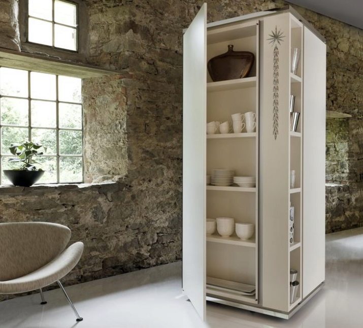 - Колонови шкафове – масивни продукти за просторна кухня; в малка стая тези гиганти ще изглеждат неуместни, въпреки че при избора на по -елегантен и стройен модел – защо не? Шкафовете с колони са удобни, защото са високи и просторни; обикновено се монтират в далечния ъгъл и се комбинират с удобна врата – тя също е функционална и надарена с малки рафтове.