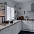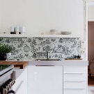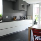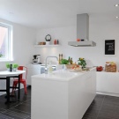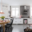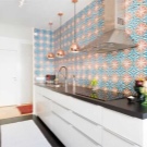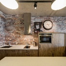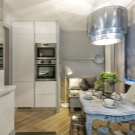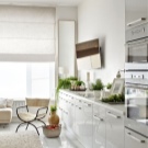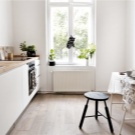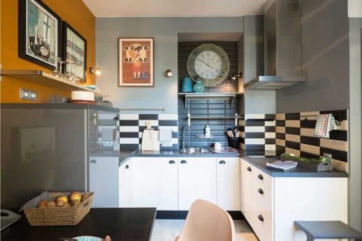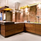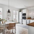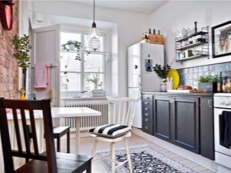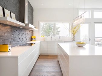Интересно решение ще бъде минималистична кухня: изберете бял лъскав кухненски комплект като мебел, поставете акцента върху една от стените: нека бъде облицована със сива тухлена зидария. Освен това добавете ярки цветове под формата на ярки детайли на мека мебел или уреди, декор и други аксесоари.