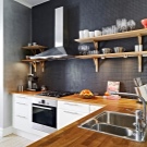 - Линеен тип предполага хоризонтално подреждане на кухненски мебели по една стена; работна повърхност, мивка, котлон – всичко е на едно и също ниво или на една и съща линия – практично и удобно. За да направите останалата част от пространството функционална, поставете отворени рафтове успоредно на работния плот, като избягвате зоната за готвене (вероятно там ще бъде монтиран аспиратор).