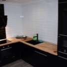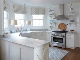 - Ъглов кухненски комплект поставен с буквата “G” и прилича на линеен тип; този дизайн обаче е дори по -функционален от предишния: в ъгъла на кухнята можете да инсталирате молив или шкаф, важно е масивните мебели да не пречат при движение в кухнята. Ъглов модел на кухненски комплект без стенни шкафове изисква допълнителни декорации, за да запълни полученото пространство: се използват плакати и картини по стените, фотографии, цветя, декоративни елементи като свещи и фигурки, като е важно да не се прекалява и да не се превърне функционална кухня в галерия на модерното изкуство.