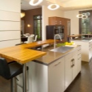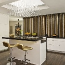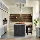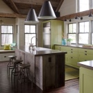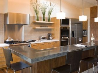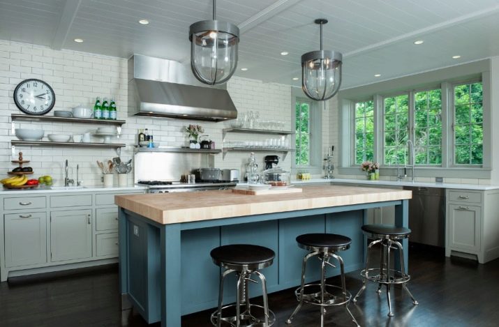 Островният тип кухня ви позволява да използвате разумно просторна стая, остава да я украсите със стилни мебели – фокусирайте се върху естествено дърво с естествен нюанс и комбинирайте с метални детайли: крака за маса, столове и други принадлежности.