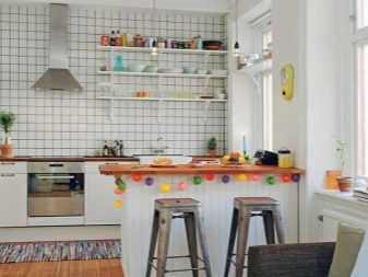Парапетът в просторна кухня без окачени шкафове ще се превърне в истинско спасение за домакините, защото на корниза с държачи за куки можете да поставите малки висящи рафтове за съхранение на импровизирани кухненски инструменти за почистване или подправки, продукти (масла, например) и други важни елементи. Удивително е колко функционален е парапетът и колко оригинален може да бъде неговият дизайн и цвят: черен, бял, метален, матов или лъскав.