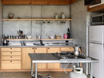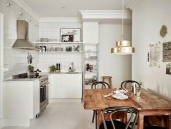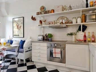 По -бюджетна версия на кухнята без стенни шкафове ще бъде стая с лаконични и прости мебели от MDF и стенен рафт със същия нюанс; нека последният да бъде масивен и да даде на стаята оригиналност. Голям рафт на колела ще служи като остров за просторна кухня: можете да инсталирате мивка или плот в него: тогава колелата ще служат само като интересно дизайнерско решение, а не като функционална част.