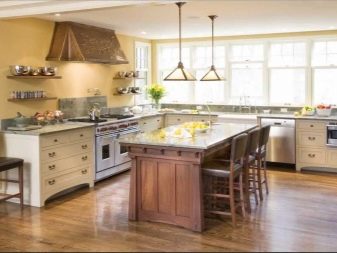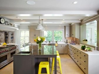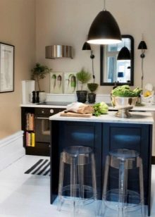 - Островен тип кухнята е подходяща изключително за просторна стая с площ от 20 кв. m, защото включва поставяне на функционален остров в средата на стаята. Важно е да се отбележи, че достъпът до “острова” в кухнята трябва да бъде осигурен от 4 страни, след което кухнята може да се нарече островна и да се насладите на нейната естетика и функционалност.