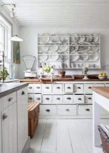 Първото нещо, с което се сблъскват бъдещите собственици на кухня без окачени шкафове, е въпросът: къде да съхранявате съдовете? Основното “съхранение” на кухненските атрибути ще бъдат долните чекмеджета и шкафове, така че трябва да се погрижите за максималната им просторност и функционалност.: вътрешното подреждане на рафтовете трябва да съответства на количеството на вашите съдове, а с голям набор от кухненски аксесоари се уверете, че има повече рафтове (дори и да са с по -ниска височина).