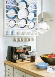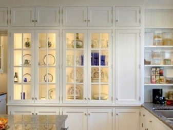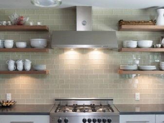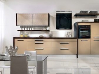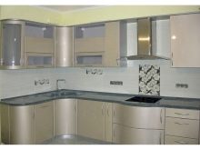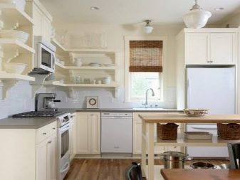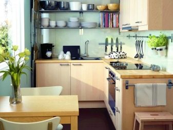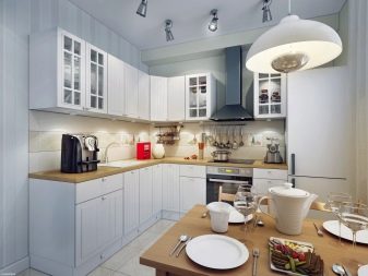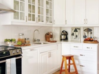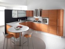 Висящите шкафове от горното ниво могат да бъдат заменени изцяло или частично с шарнирни рафтове. Тази техника прави пространството леко и отворено. От страната на свободния ръб в ъгловия комплект е по -добре да направите шкафове със заоблена форма. Като добавим към тях врати със стъкло, визуално разширяваме и олекотяваме кухненското пространство.