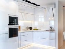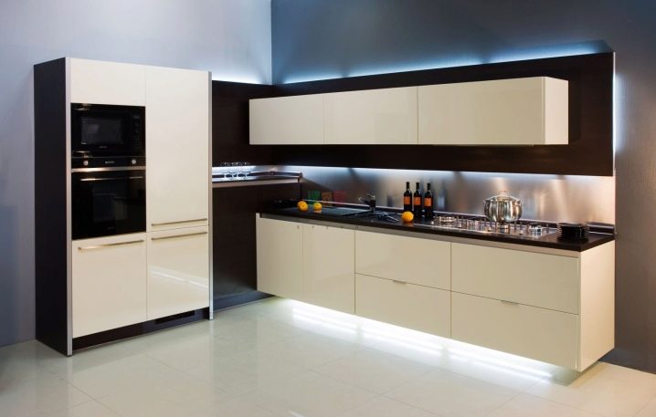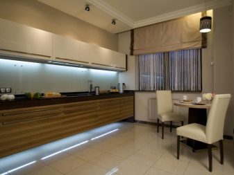 Осветлението вътре в стенните шкафове със стъклени врати изглежда красиво. Ако направите осветлението под долния ред на кухненския модул, ще останете с впечатлението, че кухнята се носи във въздуха. Украсете стаята и оформете аплици на стената близо до зоната за хранене.