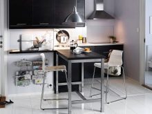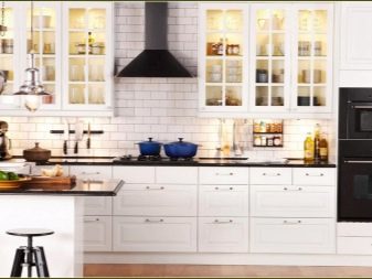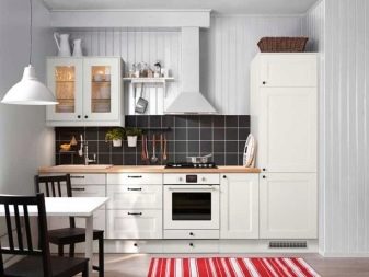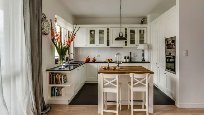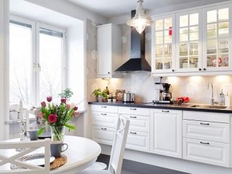 Пространството не трябва да се натрупва с много мебели. В същото време има нужда от достатъчно място за съхранение. Тези задачи са перфектно комбинирани в кухненски комплект. Трябва да изберете кухненски комплект в даден стил, по -добър от светлите нюанси. Ако искате да добавите слушалки с тъмен или ярък цвят към светлата декорация на стаята, по -добре е да направите долния слой на слушалките в този цвят, а стенните шкафове в светлина, дори в бяло. Така кухнята ще изглежда по -лека, пространството ще бъде солидно..