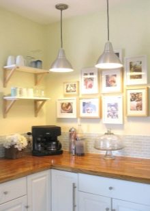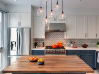 Една от основните задачи за декориране на пространство е правилното подреждане на светлината. Спецификата на използване на помещенията е такава, че освен централно осветление, работната зона трябва да бъде добре осветена. За да направите това, на тавана по протежение на работната повърхност на кухнята е необходимо да подредите прожектори или лампи на крак, за да можете да регулирате посоката на светлината. Добре е да имате допълнително осветление в зоната за хранене.