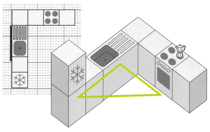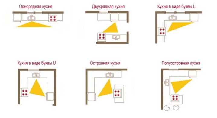 По правило местоположението на мивката е обвързано с мястото на водопровода. Ако е невъзможно да се адаптирате към съществуващите комуникации, тръбите могат да бъдат изнесени на друго място. Познавайки местоположението на мивката и използвайки принципа на работния триъгълник, е лесно да се определи местоположението на печката с хладилника.