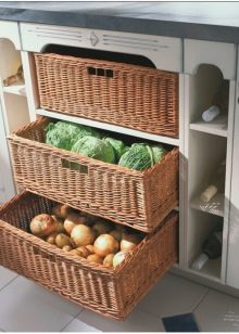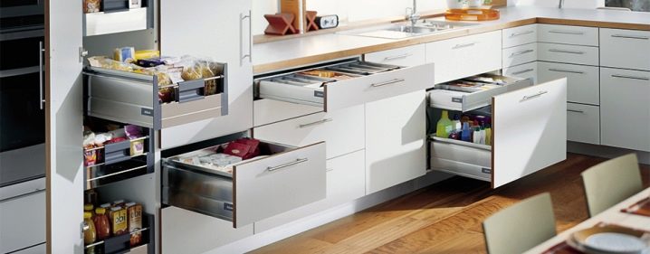 Шкафове от долния етаж на кухненски комплект с чекмеджета са по -удобни от шкаф с врати и рафт. Изваждайки чекмеджето, всичко е пред очите ви, няма нужда да се навеждате и да търсите желания предмет.